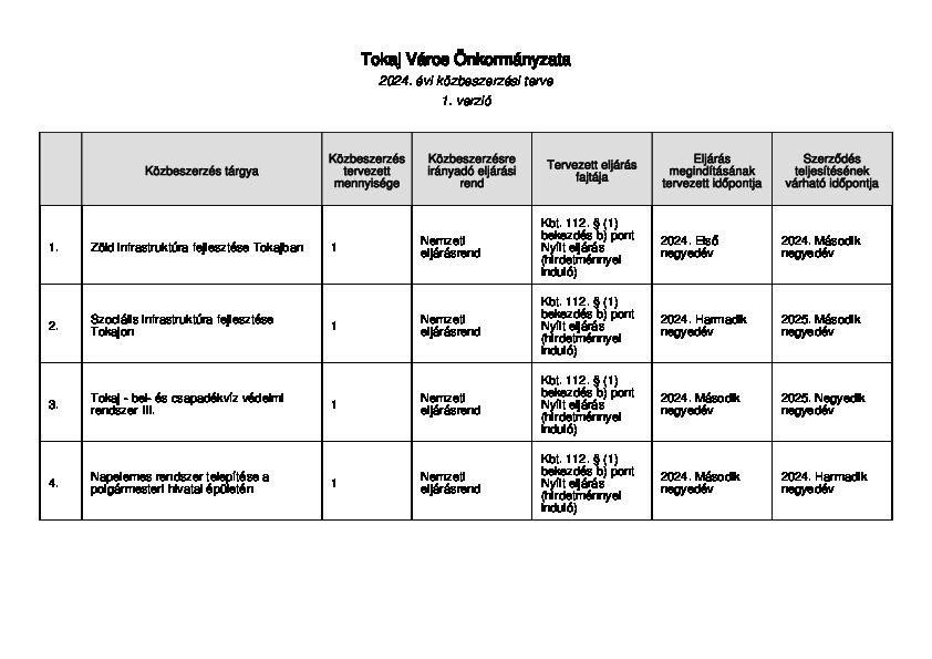 Tokaj Város Önkormányzata 2024. évi közbeszerzési terve