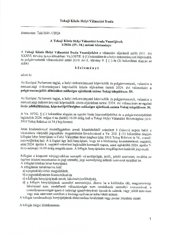 A Tokaji Közös Helyi Választási Iroda Vezetőjének 1/2024. (IV.04.) számú közleménye