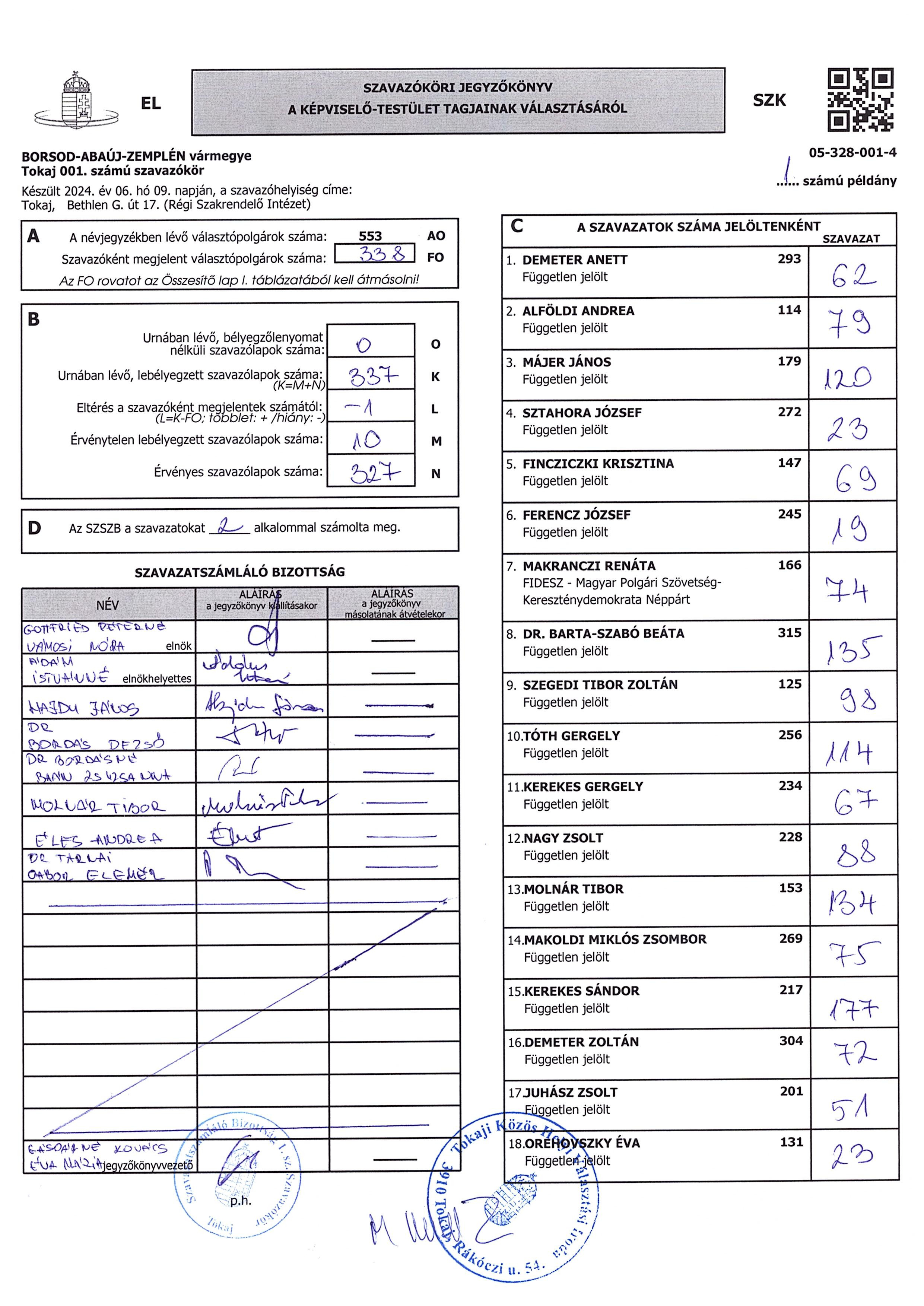 Szavazóköri jegyzőkönyv a képviselő-testület tagjainak megválasztásáról 001